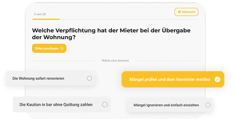 Die Befragung besteht aus Multiple-Choice-Fragen, die leicht verständlich erklärt werden. Sie dient ausschließlich der Schulung und dem Nachweis grundlegender Kenntnisse im Umgang mit Immobilien. Falls eine Antwort nicht sofort bekannt ist, wird die Lösung verständlich erläutert. Der Test kann bei Bedarf unbegrenzt bis zum Bestehen wiederholt werden.